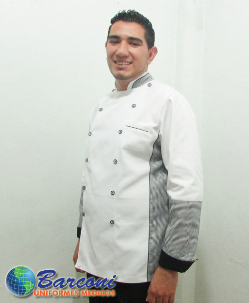Modelo Irlandes ,  Cuello tipo MAO. A los costados tiene una combinación y cuenta con diez botones y mangas Larga con una combinación en el puño.